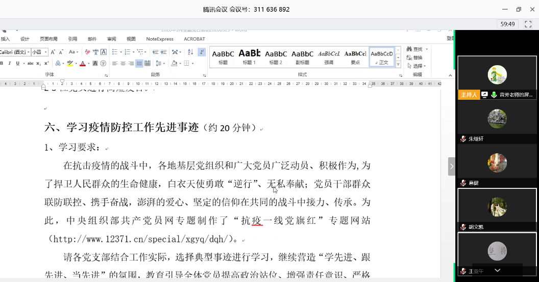的疫情防控工作和教学科研工作中,扎扎实实完成疫情防控工作和教学科研任务。陈鑫老师表示,对比国外的疫情防控出现的多种问题,国内疫情的较好控制体现了党的领导力和人民群众的积极配合,工作的全局性和调整的迅速,也展现了我们作为负责任大国的国际担当,在疫情防控中,党员同志的先锋模范带头作用也得到了充分的体现,每个人都是责任人的思想让我们每位教职工做好本职工作,做好自己的职责和担当。董凯锋老师表示,这次疫情从最开始的爆发到目前得到有效的控制,都体现了我党英明的决策,果敢的执行力,以及把为人民服务的意识始终贯彻到实处的魅力,充分体现了我党的优越性。葛健老师讲到,国内疫情防控工作成效明显,通过和国外学习老师的交流和反馈来的感受,更能体会到国内党和政府的防控优势,全国一盘棋,积极防控。王亚午老师讲到,以习近平同志为核心的党中央把人民群众生命安全和身体健康放在第一位,迅速做出一系列重大决策,作为一名党员,需要进一步增强“四个意识”、坚定“四个自信”、做到“两个维护”,坚决贯彻落实习近平总书记重要讲话和一系列重要指示精神,牢记人民利益高于一切,紧密结合岗位职责,从自身做起,以实际行动践行听党话、跟党走的初心使命,体现“三个表率”的使命担当。其他老师或发言或将以文字的形式,阐明了自己的学习心得。