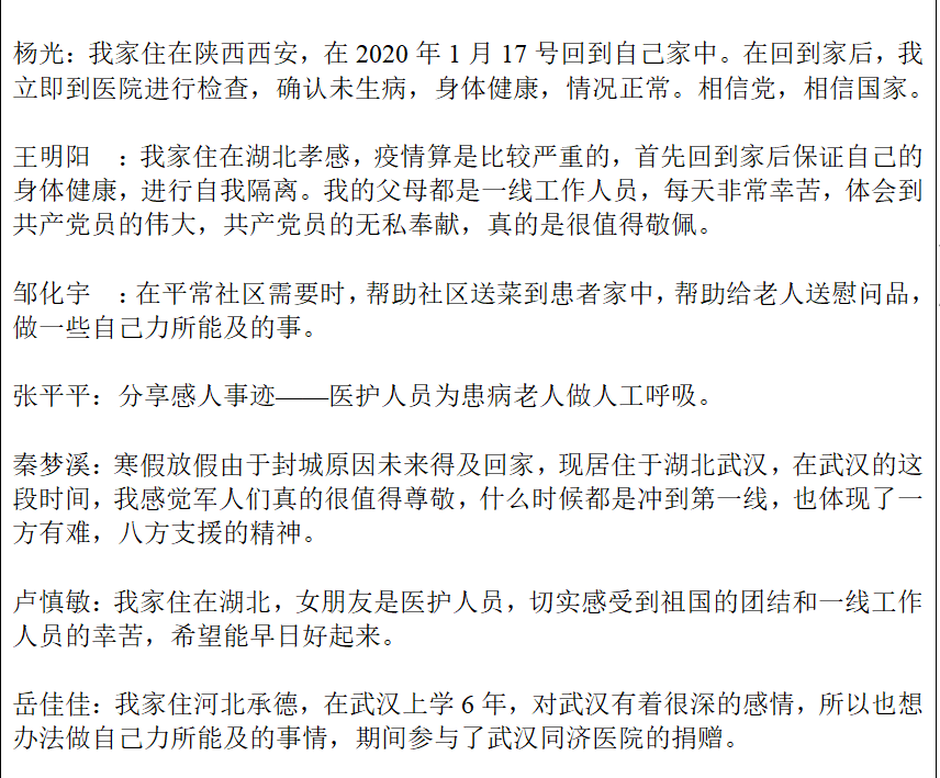 一大学生党支部自2月10日以来,先后以线上组织生活会和主题党日的形式围绕防疫防控态势、习近平总书记关于坚决打赢疫情防控阻击战的重要指示、防疫前线先锋模范事迹开展学习,支部党员谈了个人感受和体会。