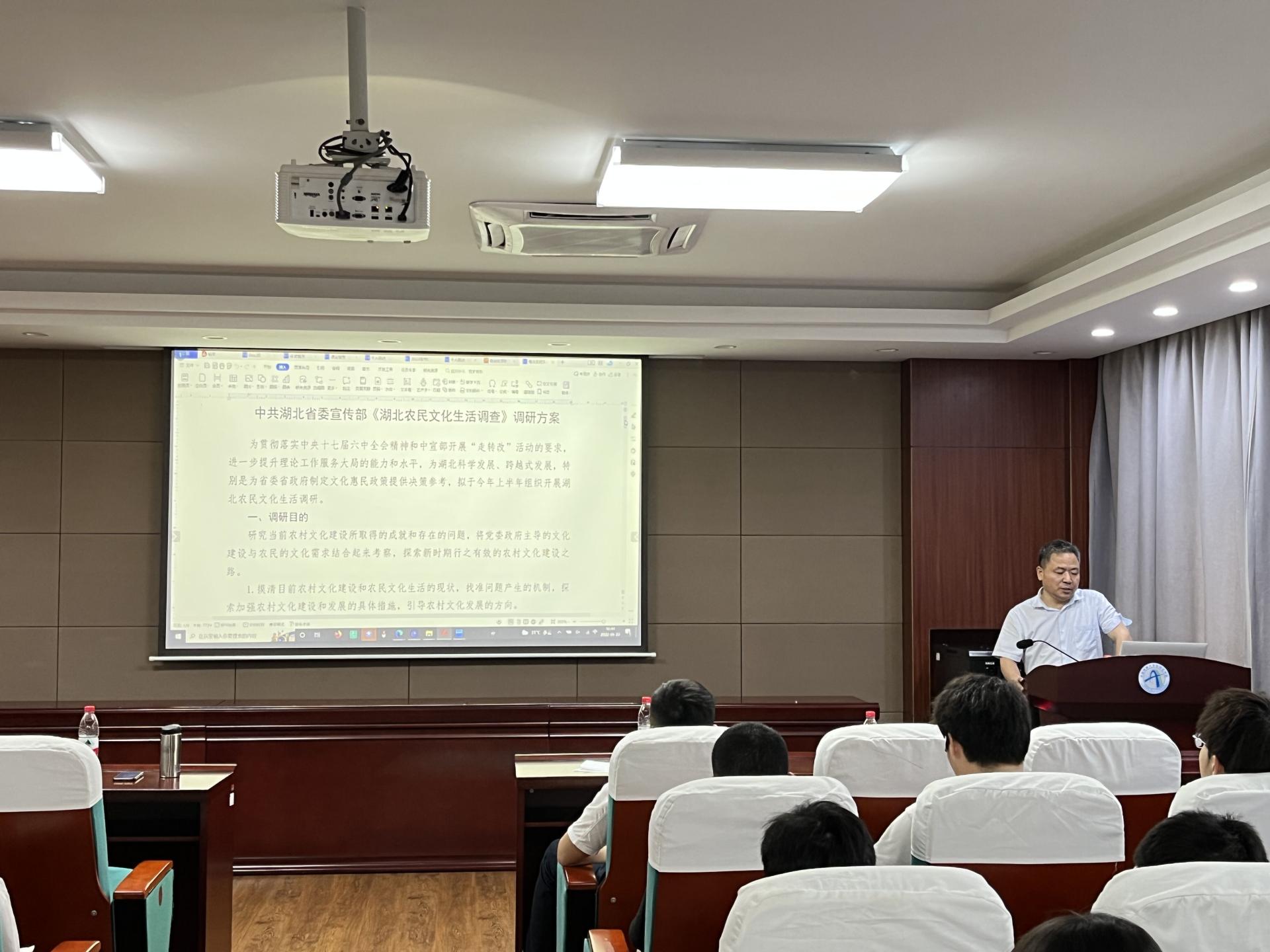 随后,卢文忠教授以《湖北农民文化生活调查》调研方案为例,给同学们做了如何开展社会调查和撰写社会调查报告的具体指导,讲解了社会调查的目的、方法,针对调研报告中的调研目的、调查对象、调查内容、重点探讨问题、调查形式、问卷调查设计等多方面进行了讲解,同学们收获颇丰。