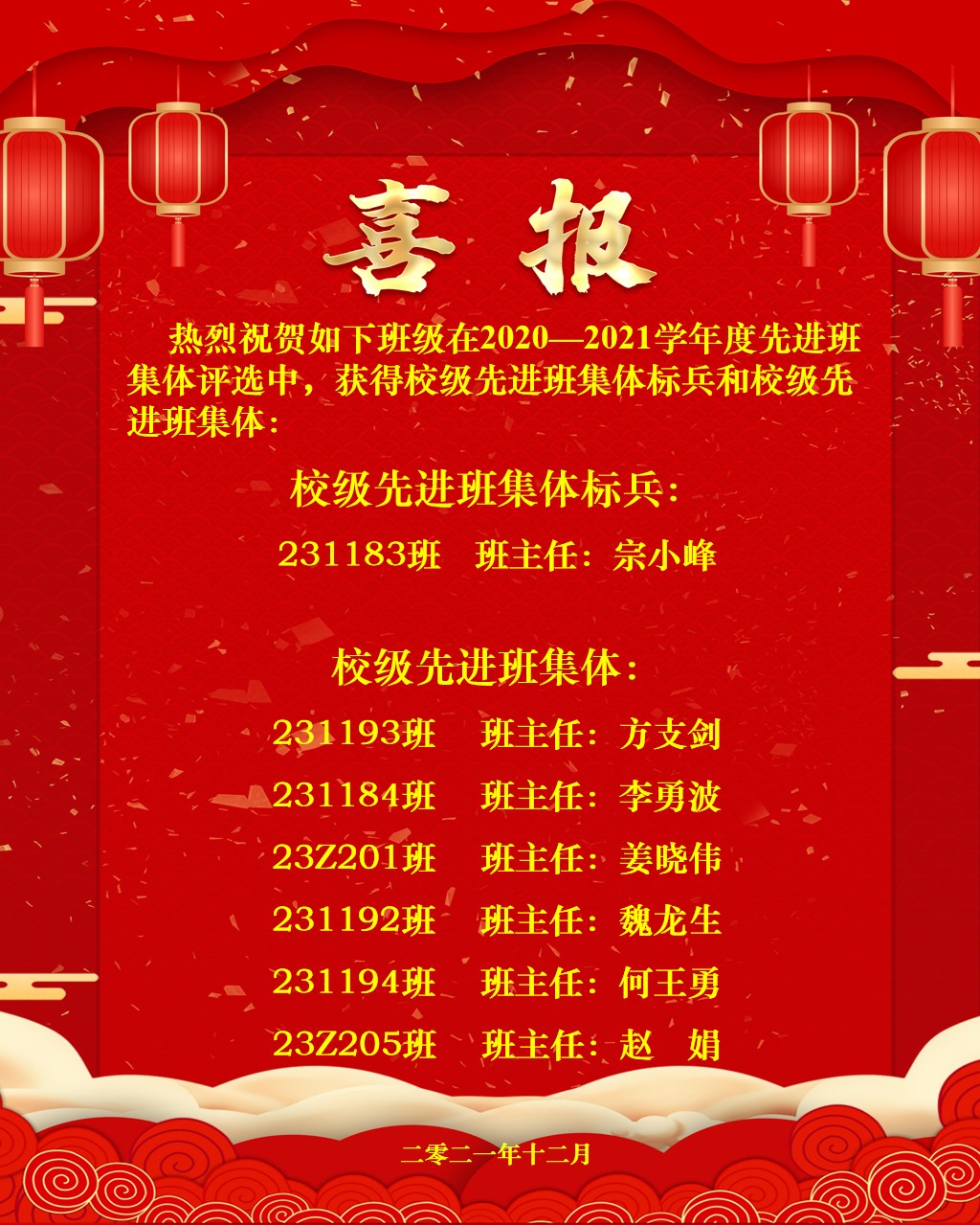 根据《关于做好2020-2021学年度先进班集体(标兵)评选工作的通知》、《关于开展2020-2021学年先进班集体标兵评审答辩工作的通知》,经过禁漫天堂下载 自评、学校评审,评定先进班集体标兵(综合奖)20个、先进班集体标兵(单项奖)7个、先进班集体104个,禁漫天堂下载 以下班级获得校级先进班集体标兵、校级先进班集体: