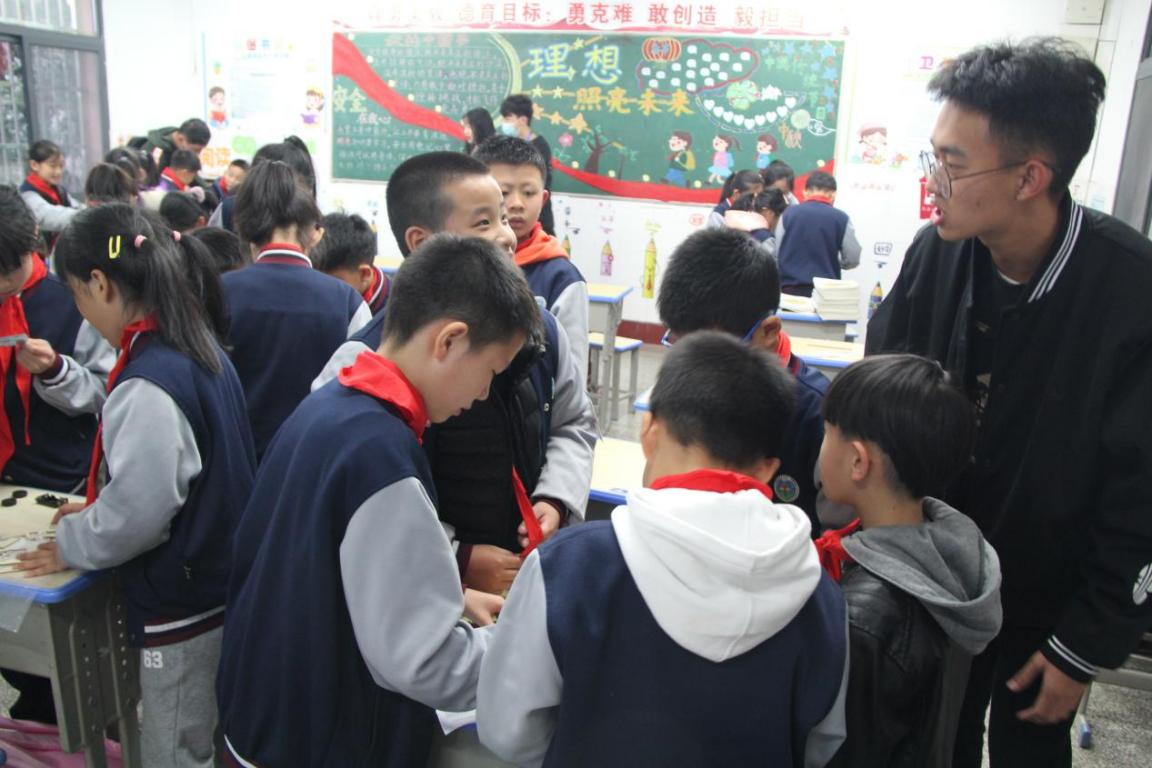 领域的了解,激发他们的专业兴趣。随后,志愿者们为大家介绍电源、电路、电池、电压、导体、绝缘体等相关科学小知识,小朋友们都踊跃举手发言提问,表达自己的思考成果,现场气氛异常活跃。最后,志愿者们为大家讲解“电动小车”和“手摇发电机”的制作方法,同时分发相关制作材料,把同学们分成6个小组进行简易电磁小车的制作,同学们开展实际操作,志愿者们为在制作过程中遇到问题的小朋友们提供帮助和指导,将他们困惑的地方再做具体讲解,理论和实践充分结合。在制作完成后,志愿者“小老师们”还给地大附小的同学们布置了一些课后作业,进一步引发同学们的思考。