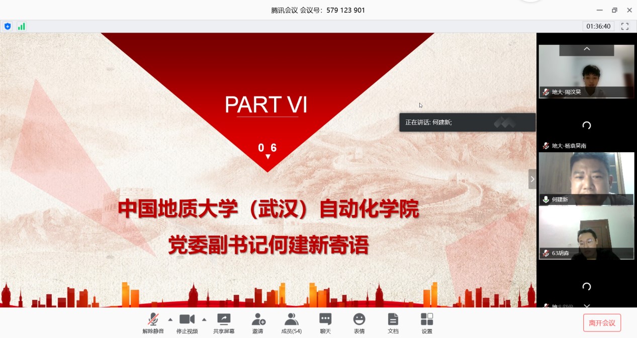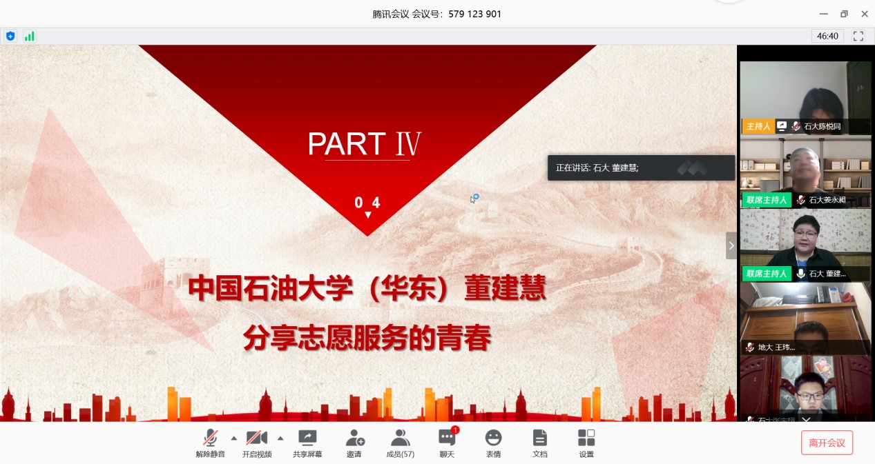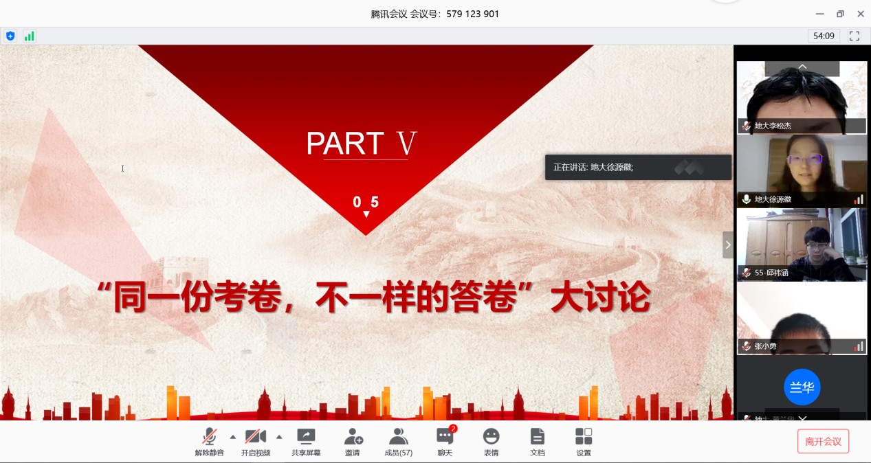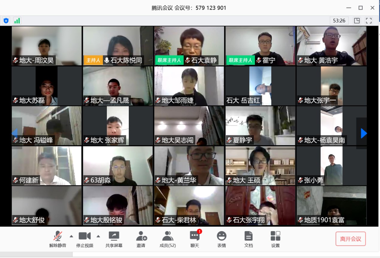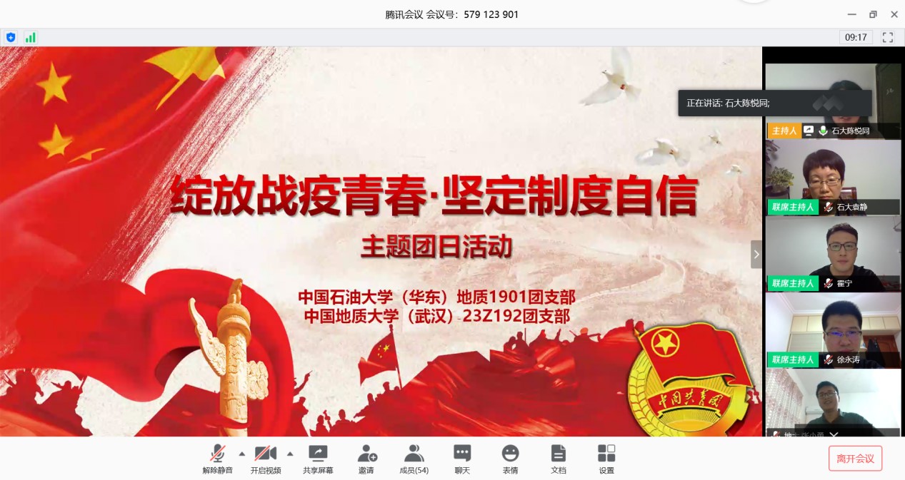 (武汉)和中国石油大学(华东)多名同学发表了自己的看法。地大的徐源徽同学说到:“这次疫情对于广大青年而言是一次特殊的‘成人礼’,我们用行动证明:新时代的中国青年是好样的,是堪当大任的。”地大的孔思栋谈到:”我们每个人也要用青春去践行五四精神,让青春在为祖国,为人民,为民族,为人类的奉献中焕发出更加绚丽的光彩。” 地大的张宇一说:“在党和政府的领导下,复工复产正在有序推进,勤劳勇敢的中国人民一定能战胜疫情。”石大的刘璐璐说:“我敬畏那些在疫情中奉献的青年,我敬佩他们勇于担当,不畏艰险。”最后,石大地质1901的班长柴君林和地大23Z192班的团支书周汶昊做表态发言,周汶昊说到:“我们青年人将不负建功立业的人生际遇,不负天降大任与斯人的时代使命,不负党的期望、人民的期待、民族的重托,用努力奋斗的青春,使自己成长为一个有理想、有本领、有担当的时代新人。我们青年要在为人民服务中茁壮成长,在艰苦奋斗中砥砺意志品质,在实践中增长工作本领,让青春在党和人民最需要的地方绽放绚丽之花。”