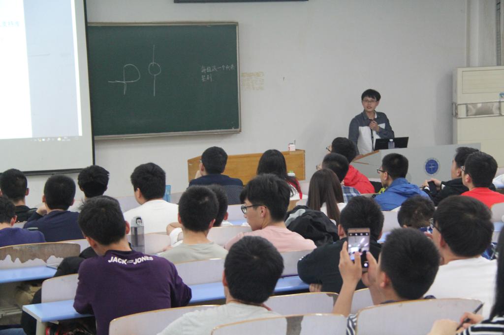 黄上都首先给初级组的同学们播放了一个循迹小车的相关视屏,让同学们对这个比赛有了初步的认识。然后再从小车的整体结构进行了分析,紧接着对小车的部分硬件做了详细的讲解。他形象的将红外对管比喻成小车的眼睛,以此解释小车是如何沿着黑线前行的;同时黄上都对超声波传感器的工作原理以及该如何计算障碍物之间的距离进行了计算说明,另外还对小车最重要的部分——电机驱动进行了深入的讲解。在培训的最后,黄上都简略地介绍了有关于小车的一些程序代码,并强调会在下一次培训中进行详细讲解,请同学们尽情期待下一次培训。