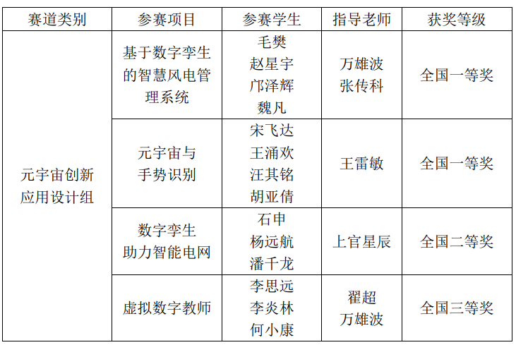 张传科教授、万雄波教授带领团队设计的《数字孪生智慧风电管理系统》,采用数字孪生技术,为风电管理与运维提供智能化、精细化解决方案,展示了元宇宙与工业4.0相关研究成果,荣获国家级一等奖。王雷敏教授指导的《元宇宙与手势识别》项目,结合元宇宙技术和手势识别技术,实现设备显示界面的场景切换、场景交互、外设调节等功能,改变传统人机交互方式,促进科技与生活的融合,荣获国家级一等奖。上官星辰教授和翟超教授指导的队伍也分别获得国家级二等奖和三等奖的好成绩。