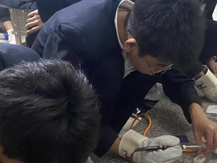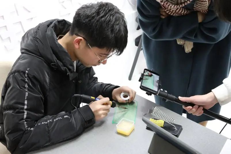在课堂的最后,志愿者向同学们演示了焊接洞洞板的过程,提醒他们有关的注意事项,并鼓励他们用分发的相关制作材料自主动手体验。通过科普小课堂,同学们不仅学到了课本以外的知识,更是在实践中激发了探索的兴趣。