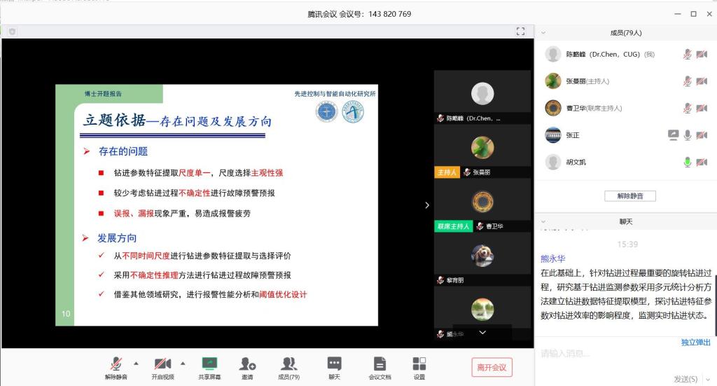 相关研究生导师和研究生等70多人参加。博士研究生马斯科、范海鹏、张正完成了开题报告,博士研究生闫泽、张曼丽完成了研究方向文献综述报告。此次采用腾讯会议方式,汇报人通过电脑客户端共享屏幕,其他参会人通过终端设备参会。整个过程秩序良好,汇报画面和语音清晰,评委老师提问有针对性,确保了报告顺利完成。