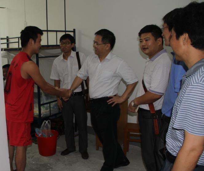 在学生寝室,院领导与新生亲切交谈。“祖籍哪里?”、“对新学校有何体会?”、“饮食是否适应?”、“天气是否适应?”、“家里有困难没有?” ……一句句贴心的问候迅速拉近了师生的距离,陌生的感觉一扫而光。吴敏院长还回忆了自己读大学的经历,他说,当时住宿的条件十分艰苦,房间空间小,更没有空调和独立卫生间,但四年的大学生生活是他最为珍贵的经历和记忆。他希望新生秉承地大“艰苦朴素,求真务实”的精神,珍惜大学的美好时光。