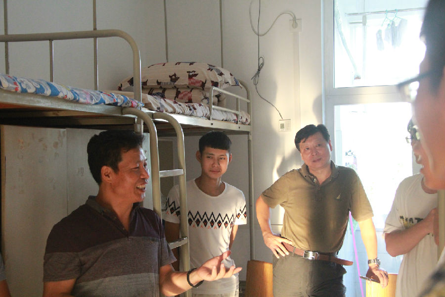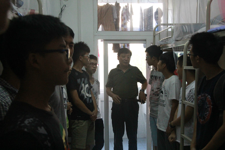 的男生寝室,关心地询问在场学生的基本情况后又给学生们一些大学学习的建议。同学们也积极与院领导交流,畅谈自己的入学感想,每到一个寝室都是欢笑声一片。