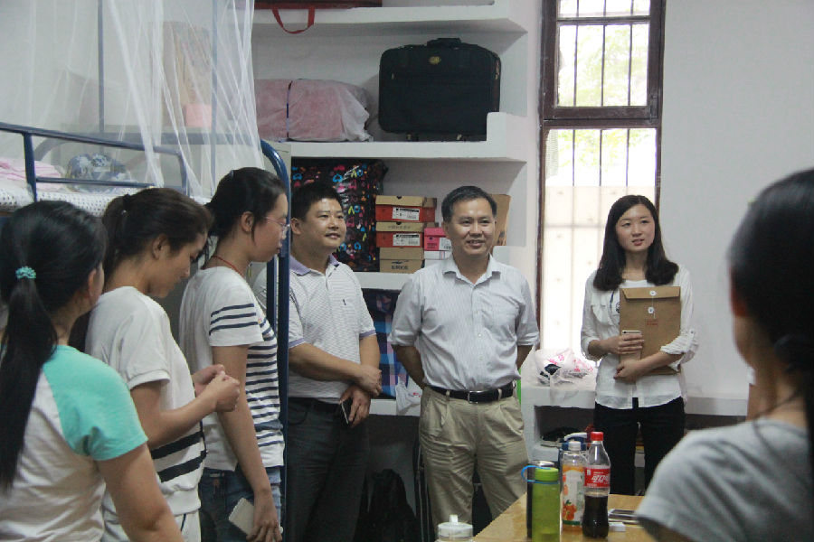 领导和老师分两组对新生寝室进行了走访。