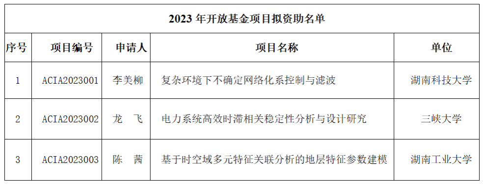 学科创新引智基地2023开放基金项目申请指南》和开放基金项目申请通知,按照“公平竞争,交叉融合”的原则,对申报的3项开放基金项目申请书进行了专家审议,拟资助 “复杂环境下不确定网络化系控制与滤波”等3个项目为2023年开放基金项目,现予以公示。公示时间:2023年12月22日至2023年12月28日。公示期间,如对项目资助有异议,请以书面形式反馈禁漫天堂下载