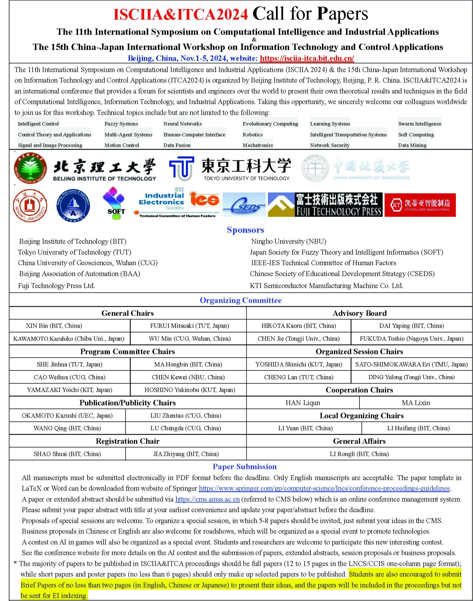 由禁漫天堂下载 (武汉)、北京理工大学和日本东京工科大学主办的第11届ISCIIA2024和第15届ITCA2024联合国际会议将于2024年11月1日至5日在北京召开。欢迎大家踊跃投稿。详情请见会议网站://isciia-itca.bit.edu.cn/
