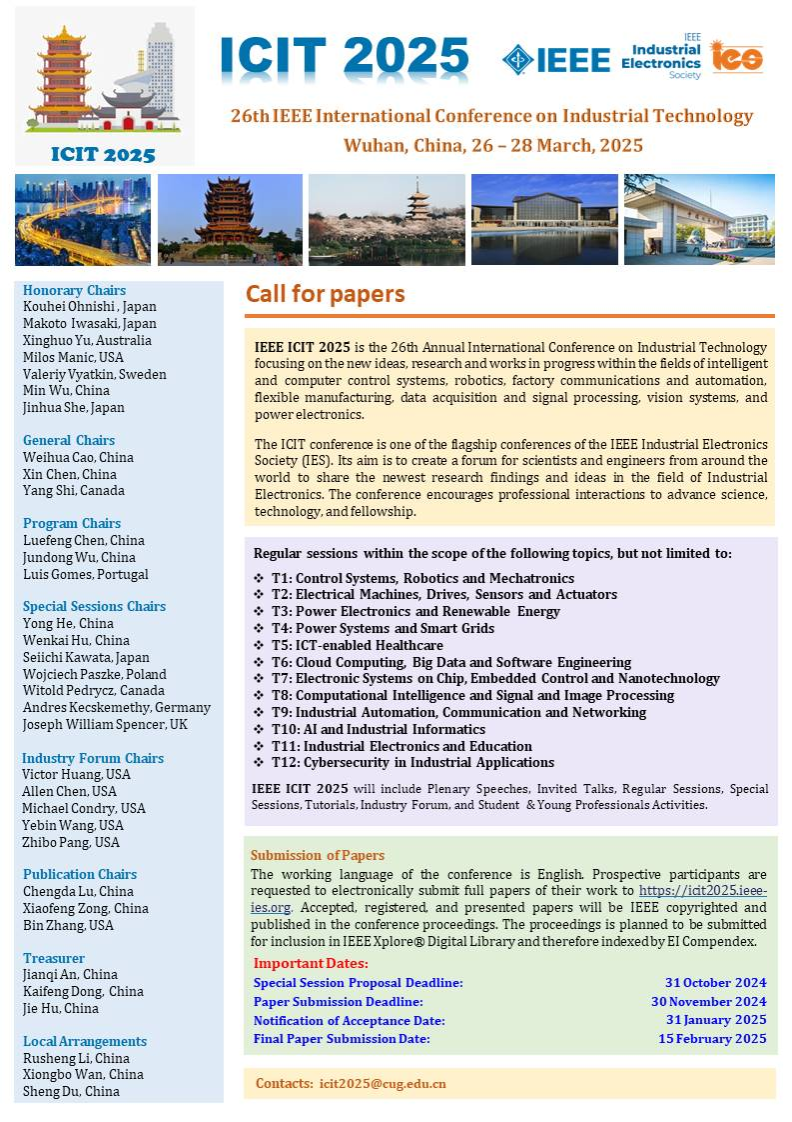 26IEEE国际工业技术大会(ICIT2025)将于2025326日至28日在中国武汉举办,由禁漫天堂下载 承办。ICIT2025重点关注智能和计算机控制系统、机器人技术、工厂通信和禁漫天堂下载 、柔性制造、数据采集和信号处理、视觉系统和电力电子等领域的新思想、新研究和新进展。