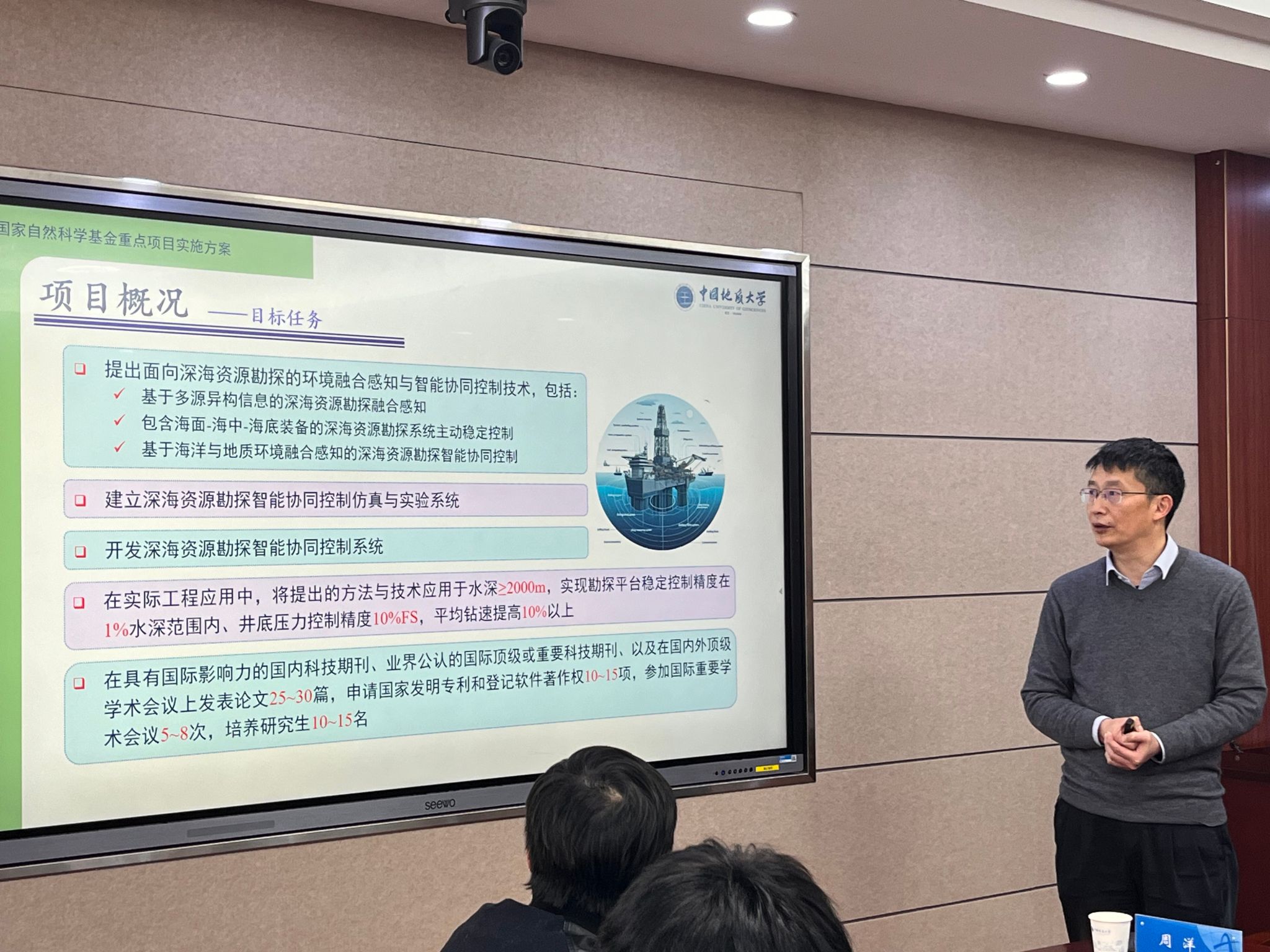 随后,王亚午教授汇报了项目子课题——深海资源勘探智能协同控制研究方案的当前成果、研究团队以及未来研究计划等。广州海洋地质调查局牟泽霖教授级高工对项目子课题——深海资源勘探智能协同控制系统集成与工程应用方案的现有工程条件与项目支撑进行了汇报。山东省第三地质矿产勘查院教授级高工张英传对项目计划及进行讲话,并希望进一步加深合作。