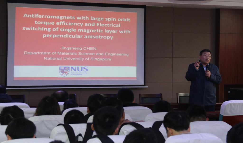 1225日,新加坡国立大学陈景升教授来禁漫天堂下载 作了题为 Antiferromagnets with large spin orbit torque efficiency and Electrical switching of single magnetic layer with perpendicular anisotropy》的学术报告。