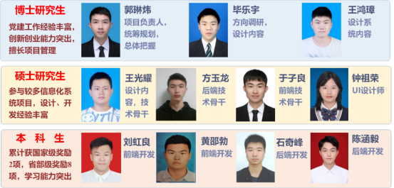 党委副书记王向东、团委书记黄兰华的指导与支持下,组建了“本-硕-博”团队,组织大家利用课余时间进行设计开发。学校党委组织部、研究生院(党委研究生工作部)、信息化工作办公室等职能部门也对该项目表示大力支持,不仅给予了专门课题立项,还配备了专家指导,为项目的顺利落地保驾护航。