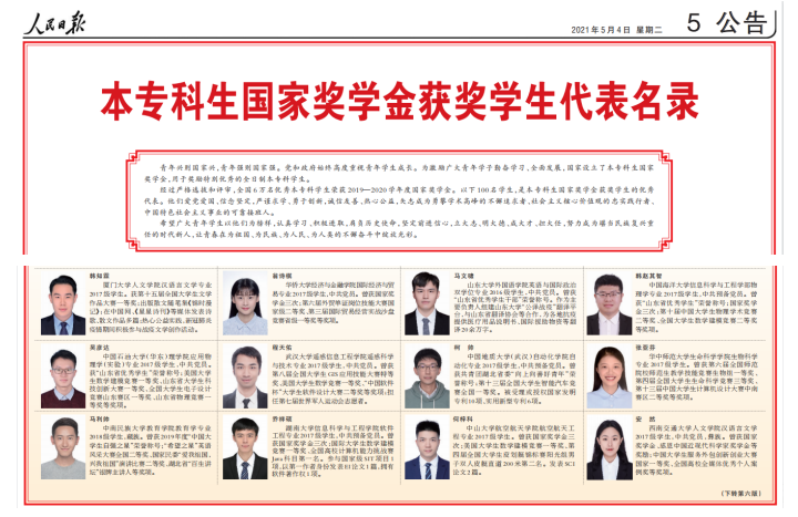 5月4日,人民日报刊发了2019-2020学年度本专科生国家奖学金获奖学生代表名录。经过严格选拔和评审,全国6万名优秀本专科学生荣获2019-2020学年度国家奖学金,100名学生入选本专科生国家奖学金获奖学生代表名录。禁漫天堂下载
