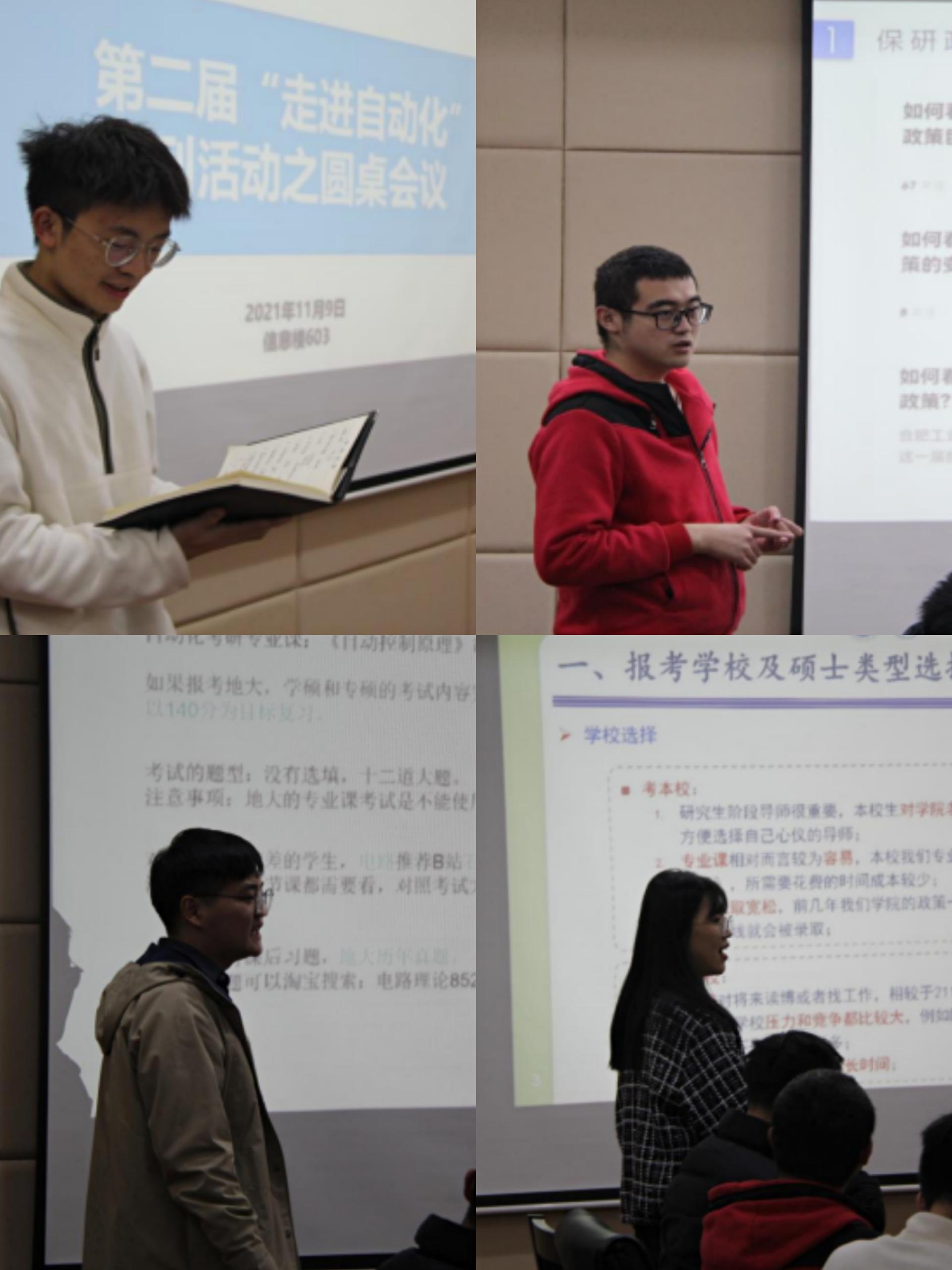 接着是同学们向学长学姐们的提问环节。同学们问到基础不太好的同学应用什么方法来面对考研?大四一边找工作一边考研会有影响吗?高数荒废了不少,还有挽救的余地吗?考研后选择的方向是什么?考研应考本校还是外校?在后来发展中学硕较专硕的优势等问题,学长学姐都一一进行了解答。