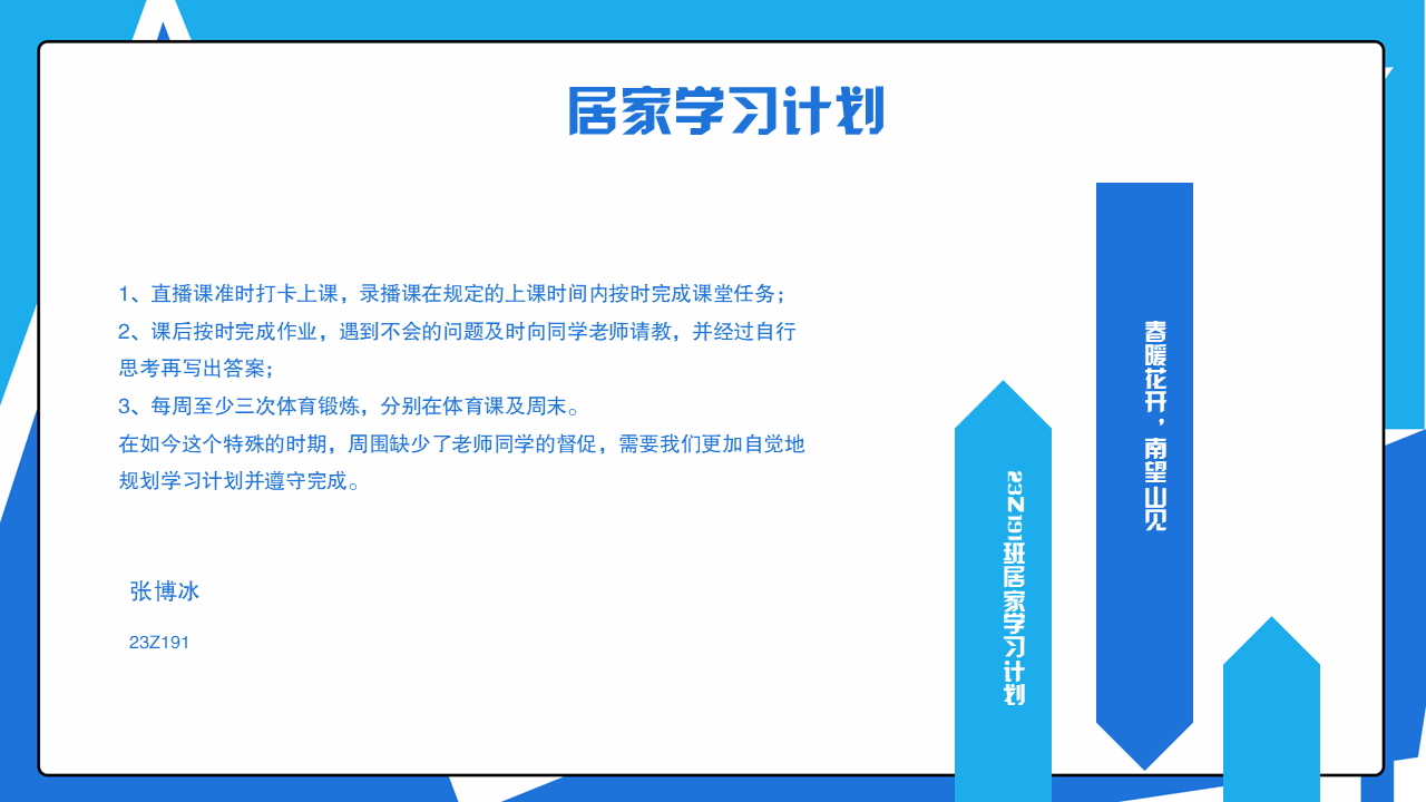 23Z191班3月1日召开本学期第一次会议-“同心抗疫,共克时艰”主题班会,班长肖纬琦同学主持会议。本次会议由四个部分组成,一是“共克时艰,抗击疫情”,二是“热爱祖国,乐于奉献”,三是“停课不停学”,四是“保持乐观,健康生活”。