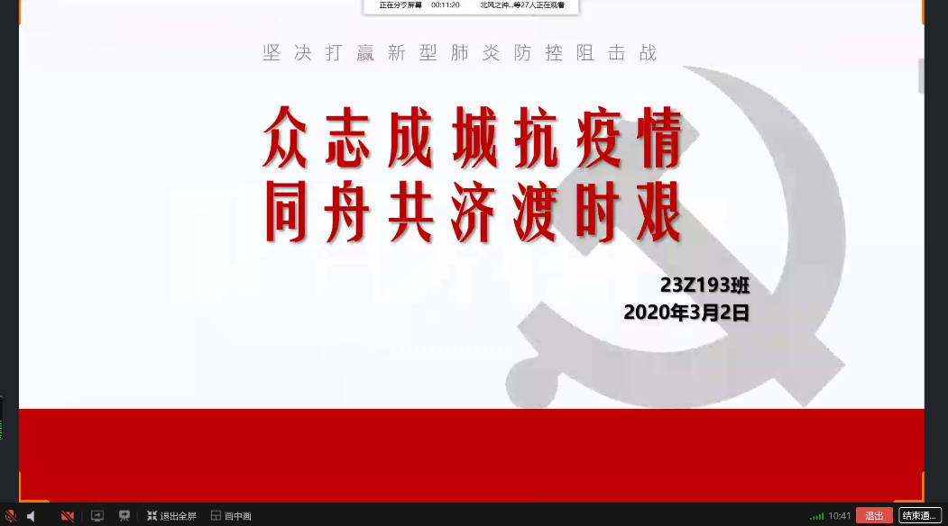 此次班会内容简洁全面,参会同学听讲认真,积极参与互动,班会整体氛围良好。在所有与会人员的共同努力下,此次“众志成城抗疫情,同舟共济渡时艰”主题班会圆满结束。