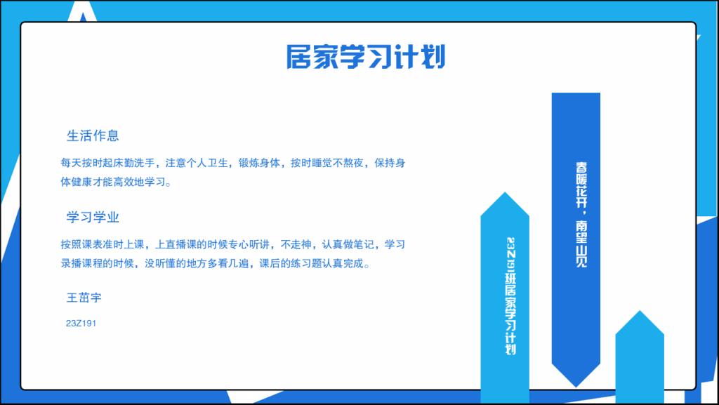 在“停课不停学”这一部分,肖纬琦提出两点要求:一是认真开展线上学习,做到停课不停学;二是居家锻炼,保持正常作息时间。肖纬琦同学强调了课堂纪律,希望大家按时上课签到,学习委员将组织班委抽查部分同学的作业,加强学业监督,提供学习支持,鼓励大家制定科学的学习计划,保证学习质量和效率。居家锻炼是本学期体育课的重要组成部分,将作为同学们体育成绩考评依据,能够帮助大家提高自身免疫力,鼓励大家通过keep等软件打卡锻炼,强健体魄。