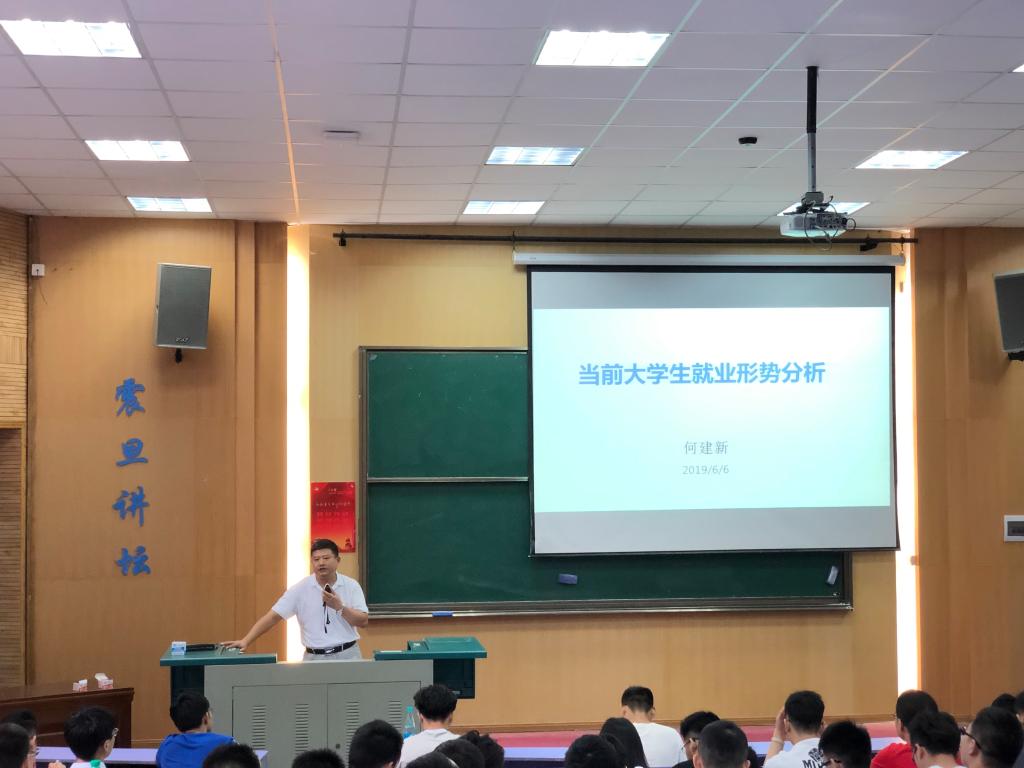 党委副书记何建新老师授课,何老师主要结合时代需要为同学们分析了当前大学生所面临的就业形势。