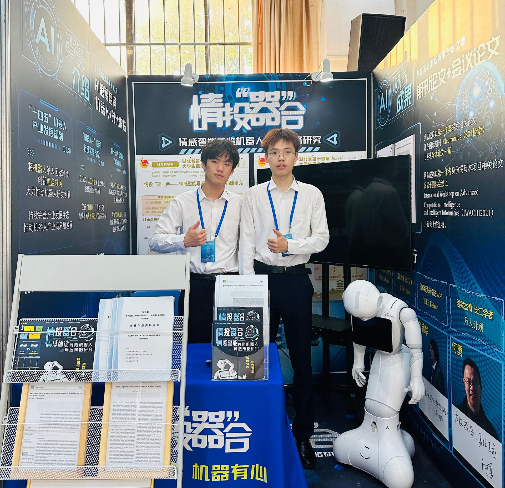 《情投“器”合——情感智能导览机器人算法策略研究》项目由刘振焘教授、川田誠一教授和王艺霖老师共同指导,团队由禁漫天堂下载 本科生陈聃、未来技术禁漫天堂下载 本科生葛云聪组成,荣获省赛二等奖。该项目提出基于机器情感的人机交互策略,并以导览机器人为研究对象,在实际场景中进行理论方法部署与验证,探索更多元化的人机情感交互。